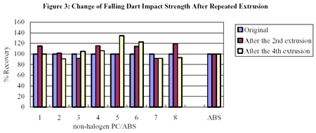 Figure 1 to 3で容易に判るように臭素系エポキシオリゴマーを難燃剤として使用した難燃ABSの機械特性は繰り返し押出後もほとんど変化せず、オリジナルと同等のレベルを維持している。